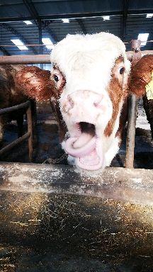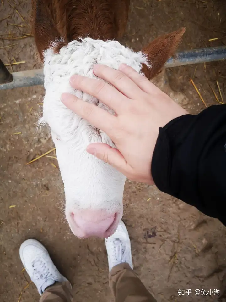 西门塔尔f4代小牛,大牛一般很怕人,小牛不怎么怕人,甚至会主动凑过来(其实是找奶吃)。