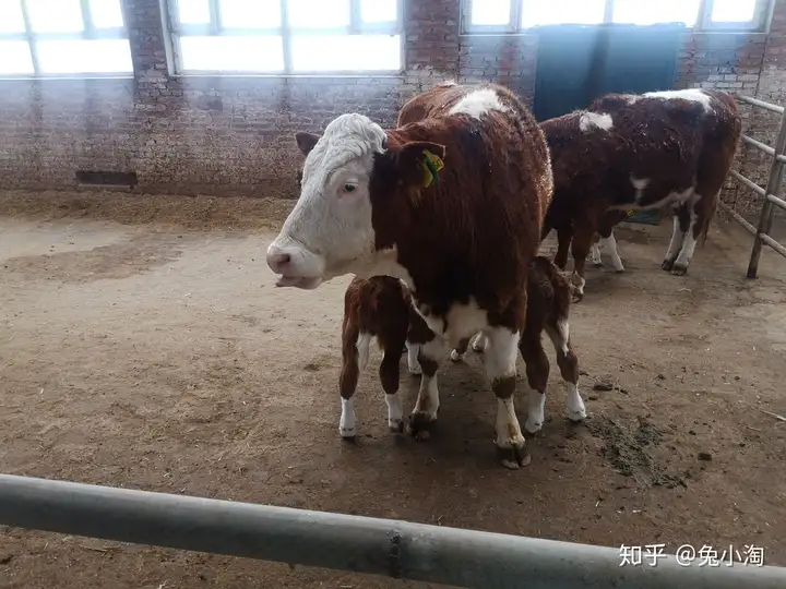 母牛护犊子心很重,一般不太会让不同母亲的小牛吃奶。图上这是人工授精的异卵双胞胎,为了解决母牛单胎困境,提高生产效率的技术。